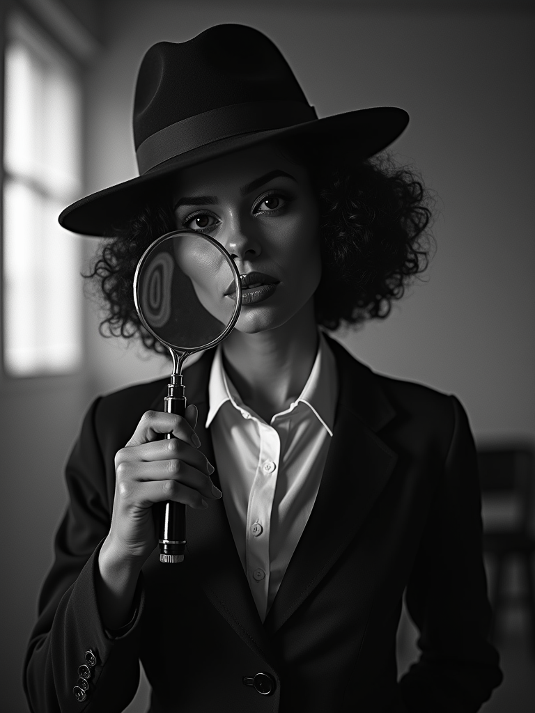 black and white 35mm film of model as a 1920s silent film detective with magnifying glass, wearing a tailored suit with feminine details, exaggerated suspicious expression , dramatic shadows, black and white with film scratches, mysterious crime scene setting