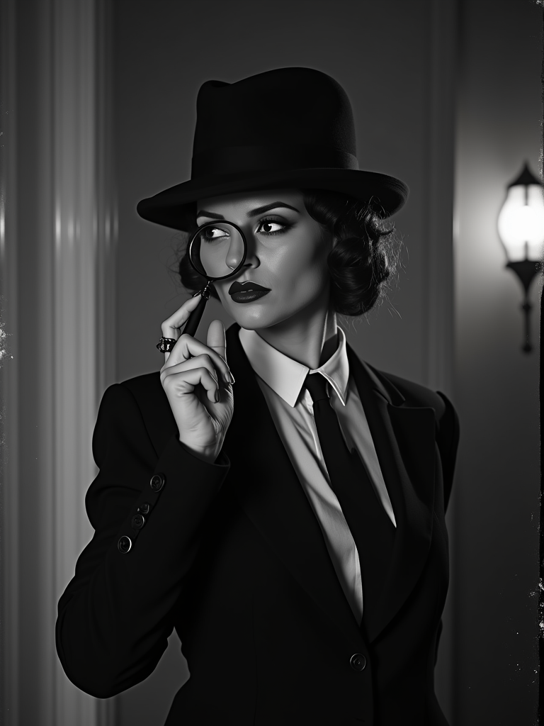 black and white 35mm film of model as a 1920s silent film detective with magnifying glass, wearing a tailored suit with feminine details, exaggerated suspicious expression , dramatic shadows, black and white with film scratches, mysterious crime scene setting
