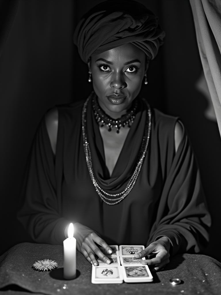 black and white 35mm film of model as a 1920s silent film medium reading tarot cards, wearing mystical robes with turban, intense hypnotic stare , candles creating dramatic shadows, black and white with smoky vignette effect, fortune teller's tent setting
