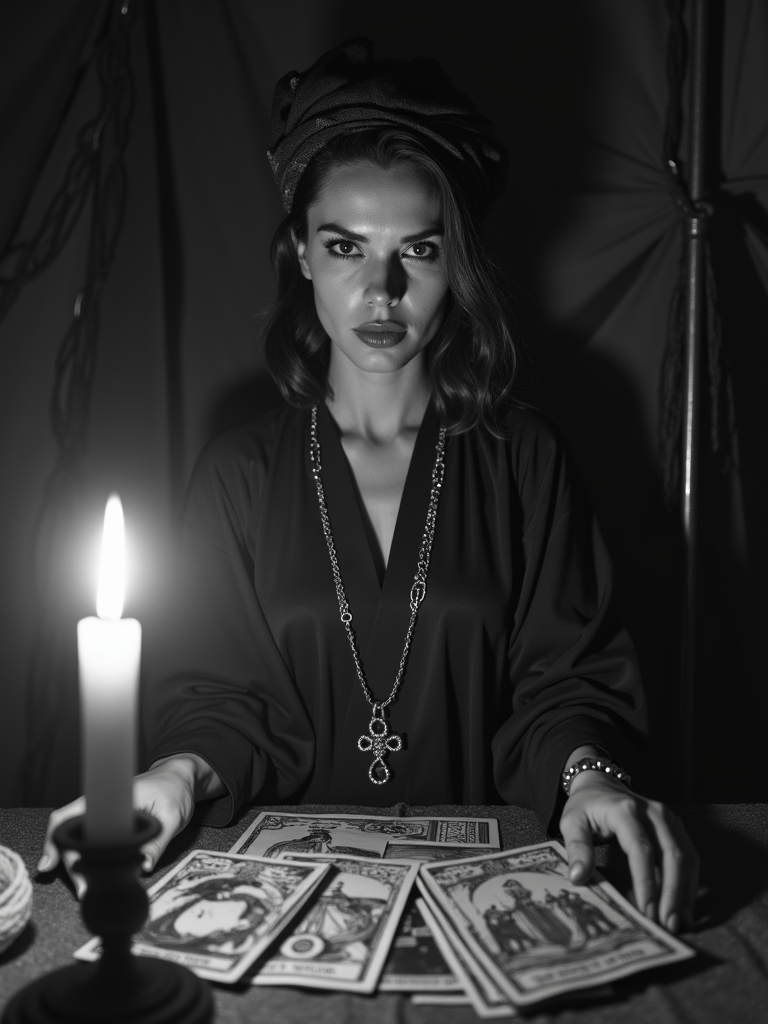 black and white 35mm film of model as a 1920s silent film medium reading tarot cards, wearing mystical robes with turban, intense hypnotic stare , candles creating dramatic shadows, black and white with smoky vignette effect, fortune teller's tent setting