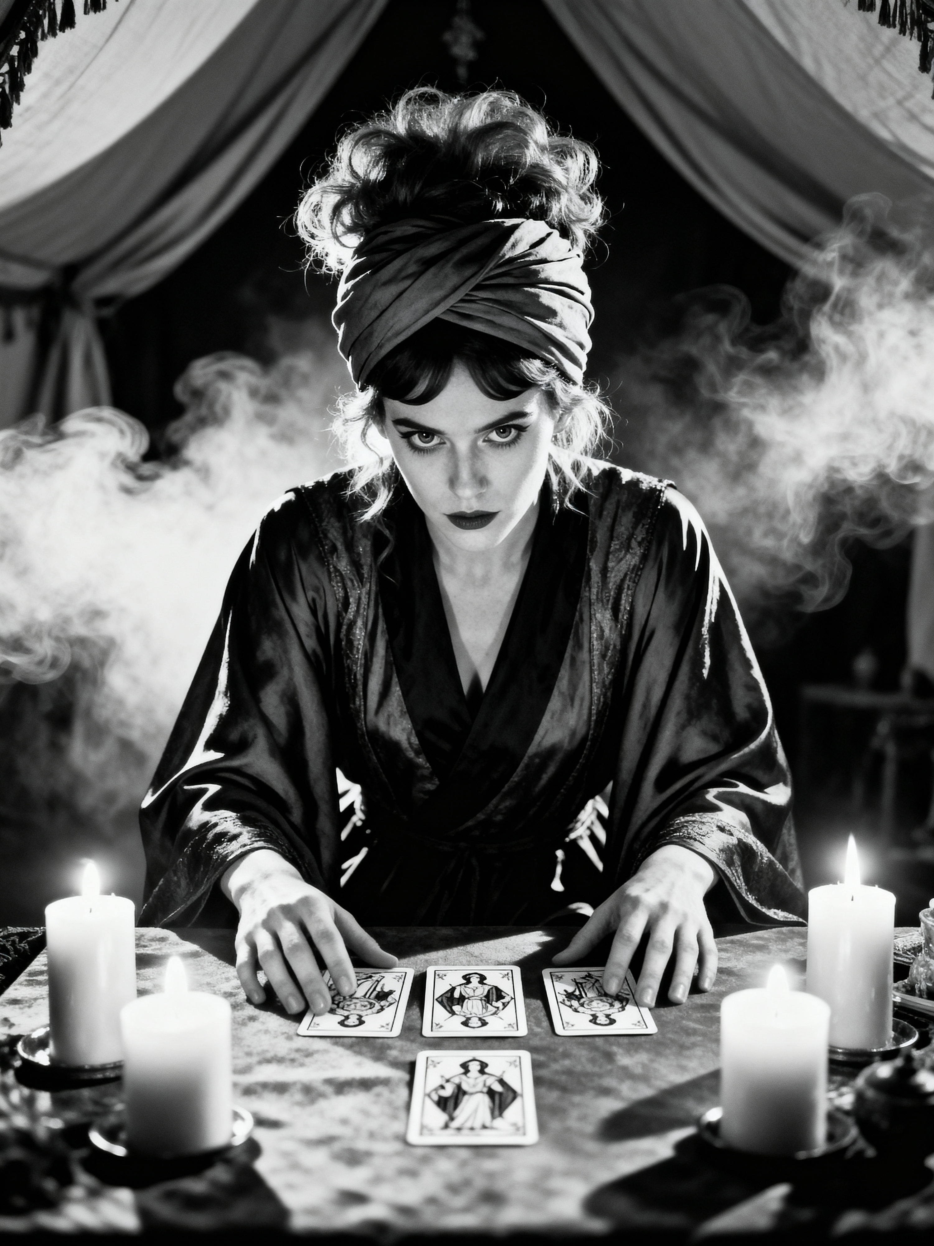 black and white 35mm film of model as a 1920s silent film medium reading tarot cards, wearing mystical robes with turban, intense hypnotic stare , candles creating dramatic shadows, black and white with smoky vignette effect, fortune teller's tent setting