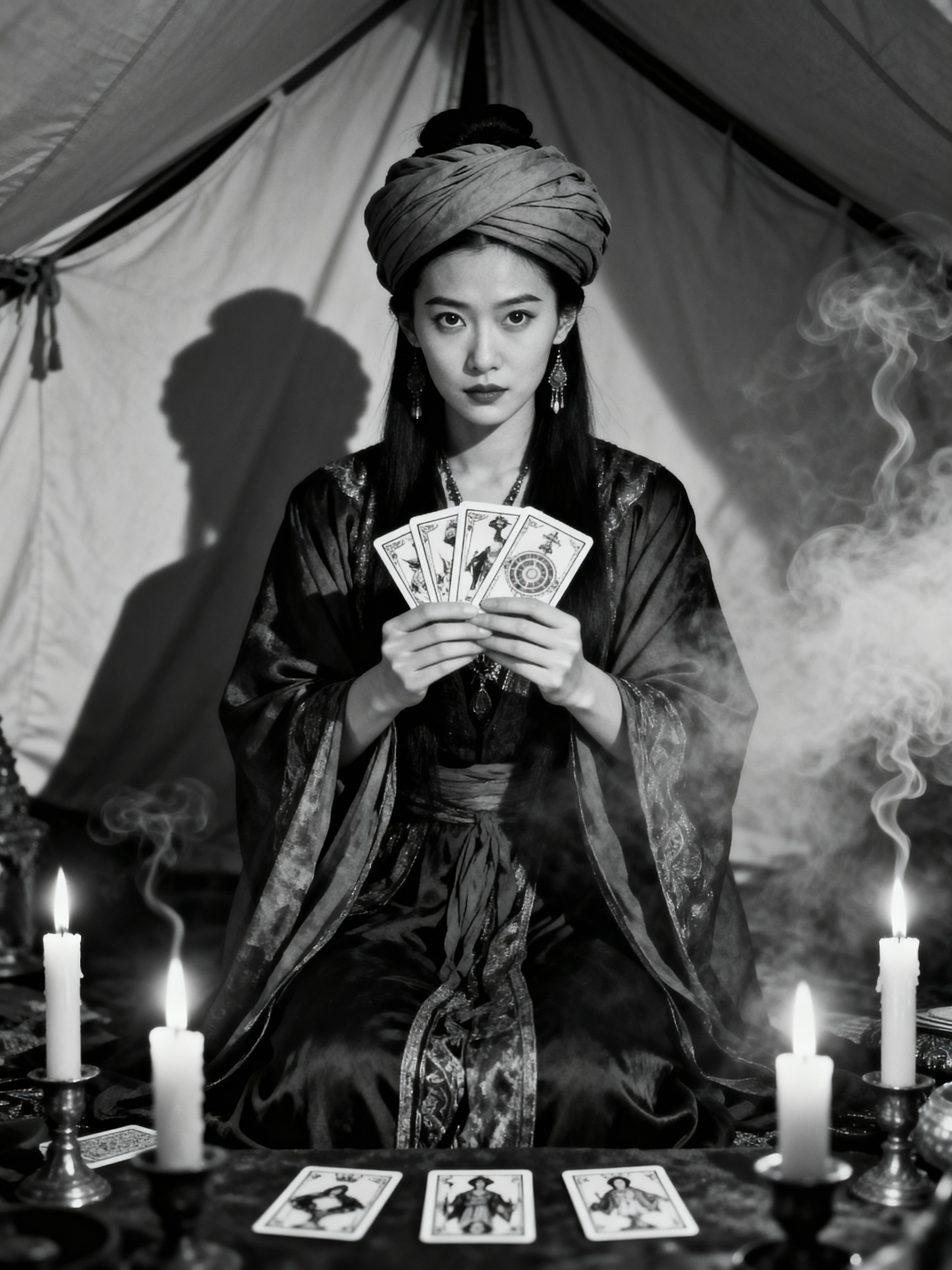 black and white 35mm film of model as a 1920s silent film medium reading tarot cards, wearing mystical robes with turban, intense hypnotic stare , candles creating dramatic shadows, black and white with smoky vignette effect, fortune teller's tent setting