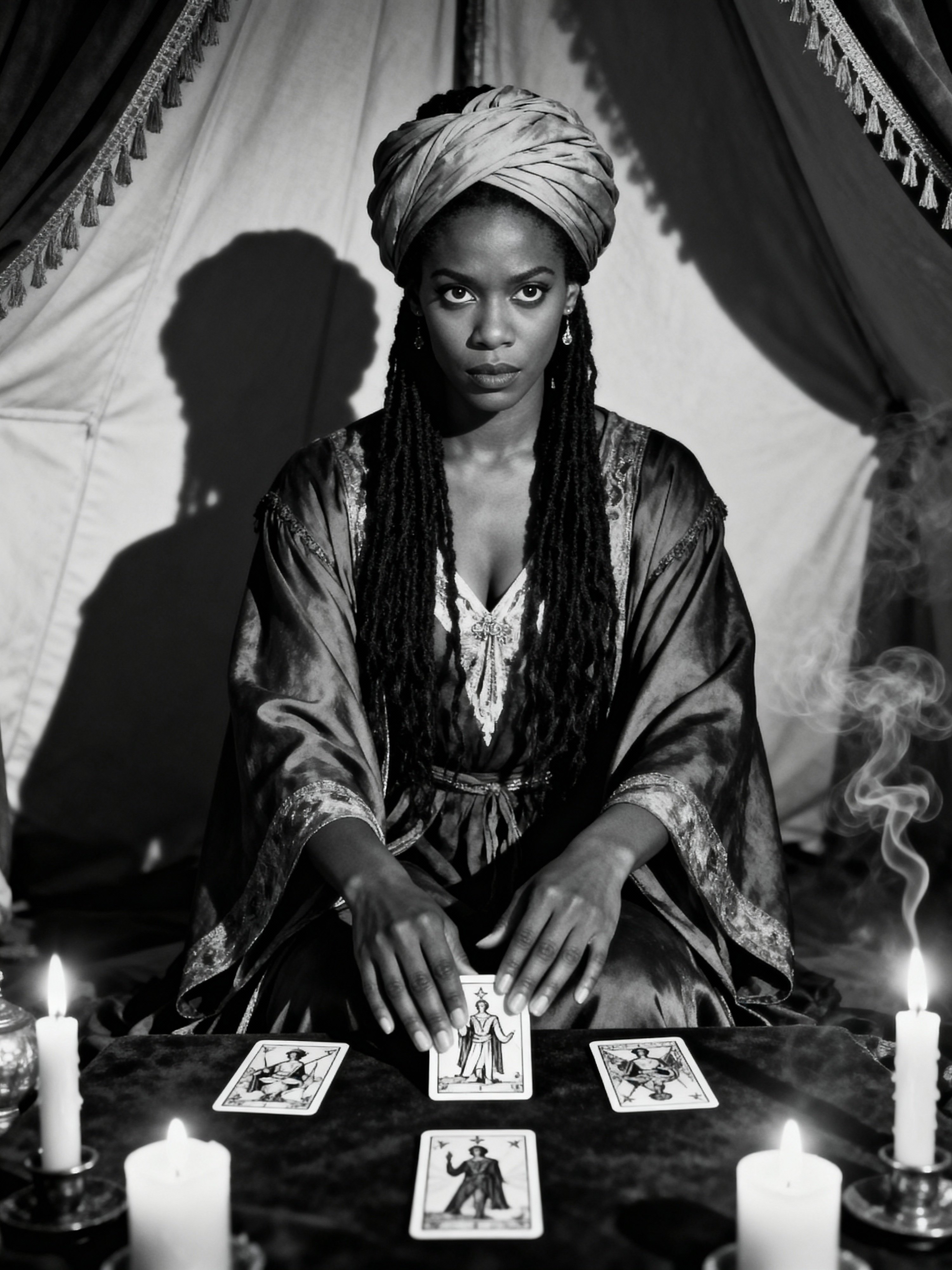 black and white 35mm film of model as a 1920s silent film medium reading tarot cards, wearing mystical robes with turban, intense hypnotic stare , candles creating dramatic shadows, black and white with smoky vignette effect, fortune teller's tent setting