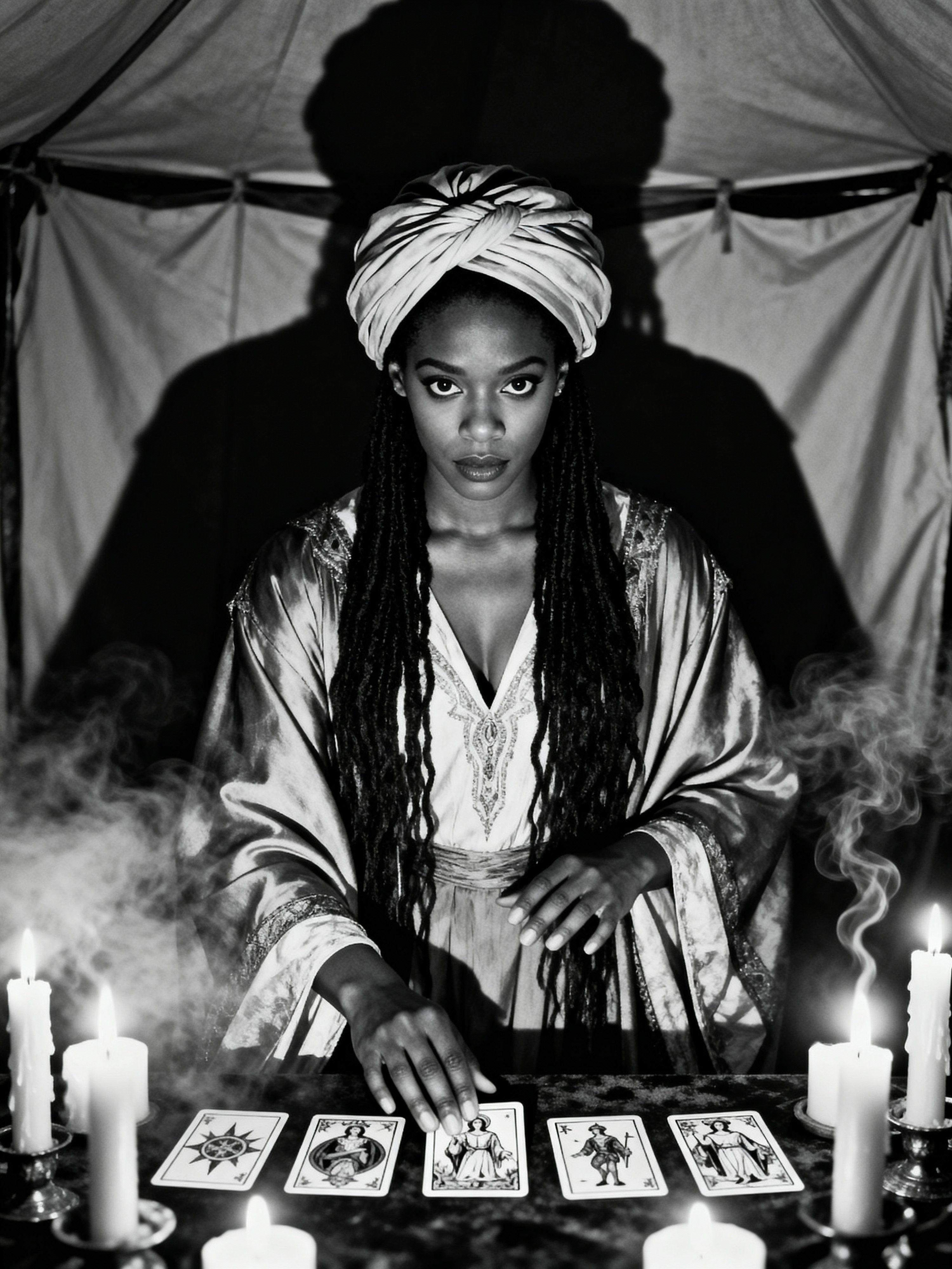 black and white 35mm film of model as a 1920s silent film medium reading tarot cards, wearing mystical robes with turban, intense hypnotic stare , candles creating dramatic shadows, black and white with smoky vignette effect, fortune teller's tent setting