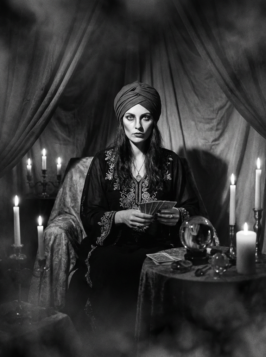 black and white 35mm film of model as a 1920s silent film medium reading tarot cards, wearing mystical robes with turban, intense hypnotic stare , candles creating dramatic shadows, black and white with smoky vignette effect, fortune teller's tent setting