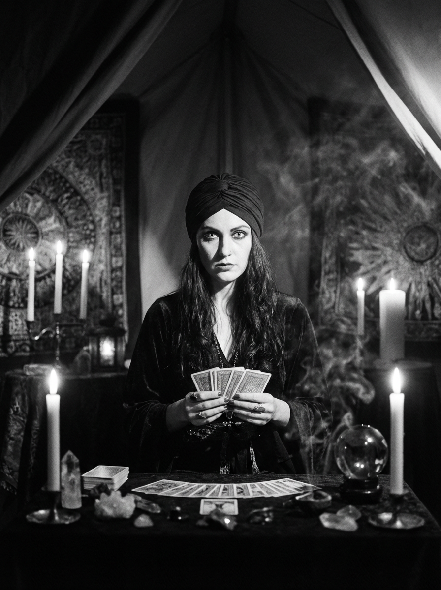 black and white 35mm film of model as a 1920s silent film medium reading tarot cards, wearing mystical robes with turban, intense hypnotic stare , candles creating dramatic shadows, black and white with smoky vignette effect, fortune teller's tent setting