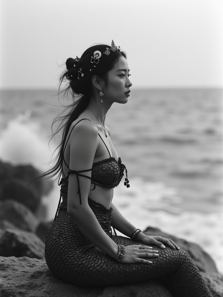 black and white 35mm film of model as a 1920s silent film mermaid on rocky shore, wearing scaled costume with shell accessories, melancholic expression gazing at sea , theatrical waves, black and white with dreamy soft focus, fantasy ocean backdrop