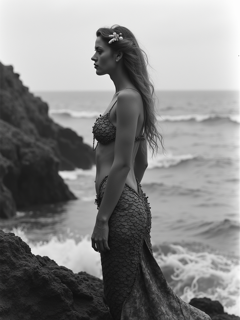 black and white 35mm film of model as a 1920s silent film mermaid on rocky shore, wearing scaled costume with shell accessories, melancholic expression gazing at sea , theatrical waves, black and white with dreamy soft focus, fantasy ocean backdrop