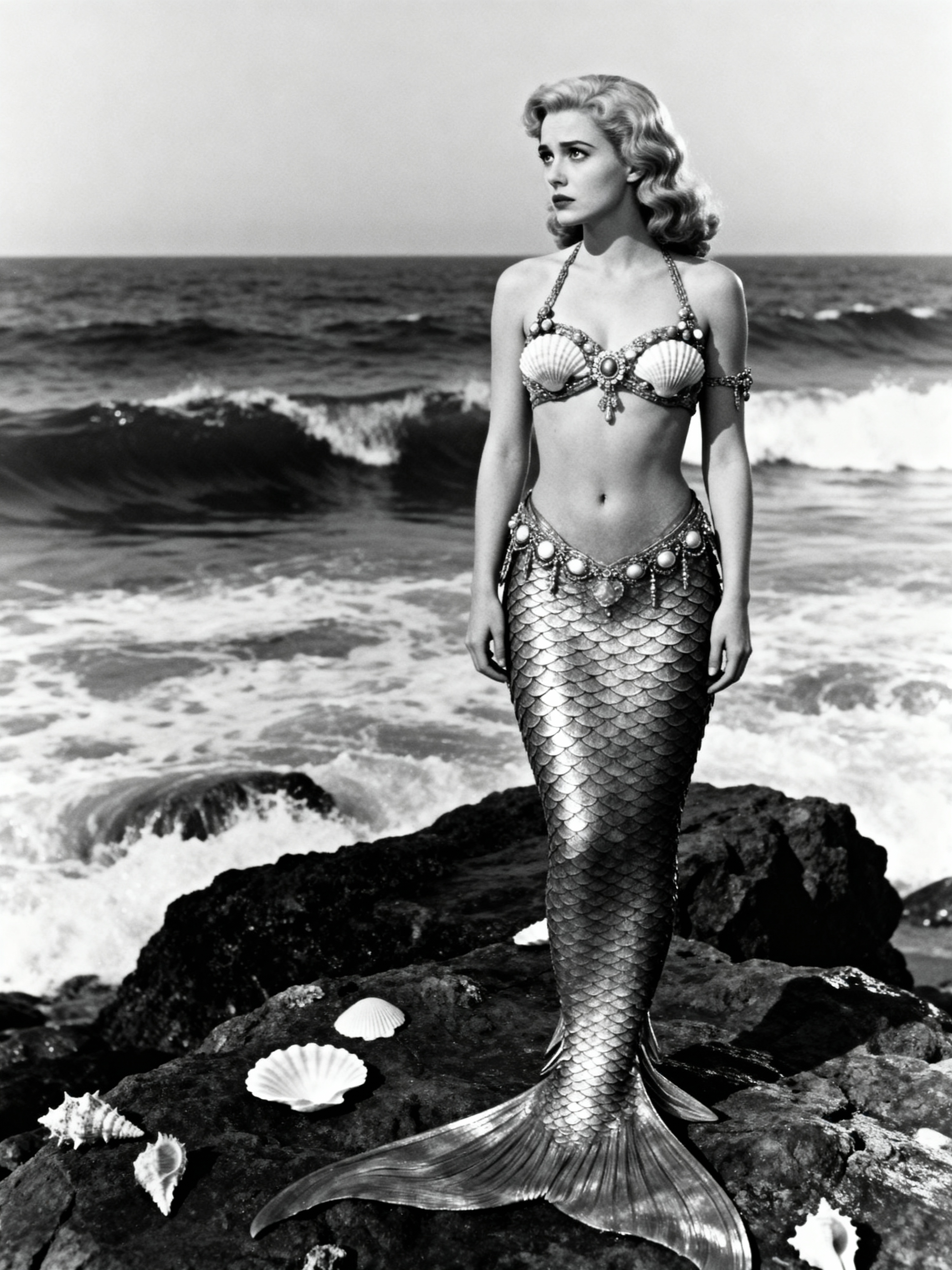 black and white 35mm film of model as a 1920s silent film mermaid on rocky shore, wearing scaled costume with shell accessories, melancholic expression gazing at sea , theatrical waves, black and white with dreamy soft focus, fantasy ocean backdrop