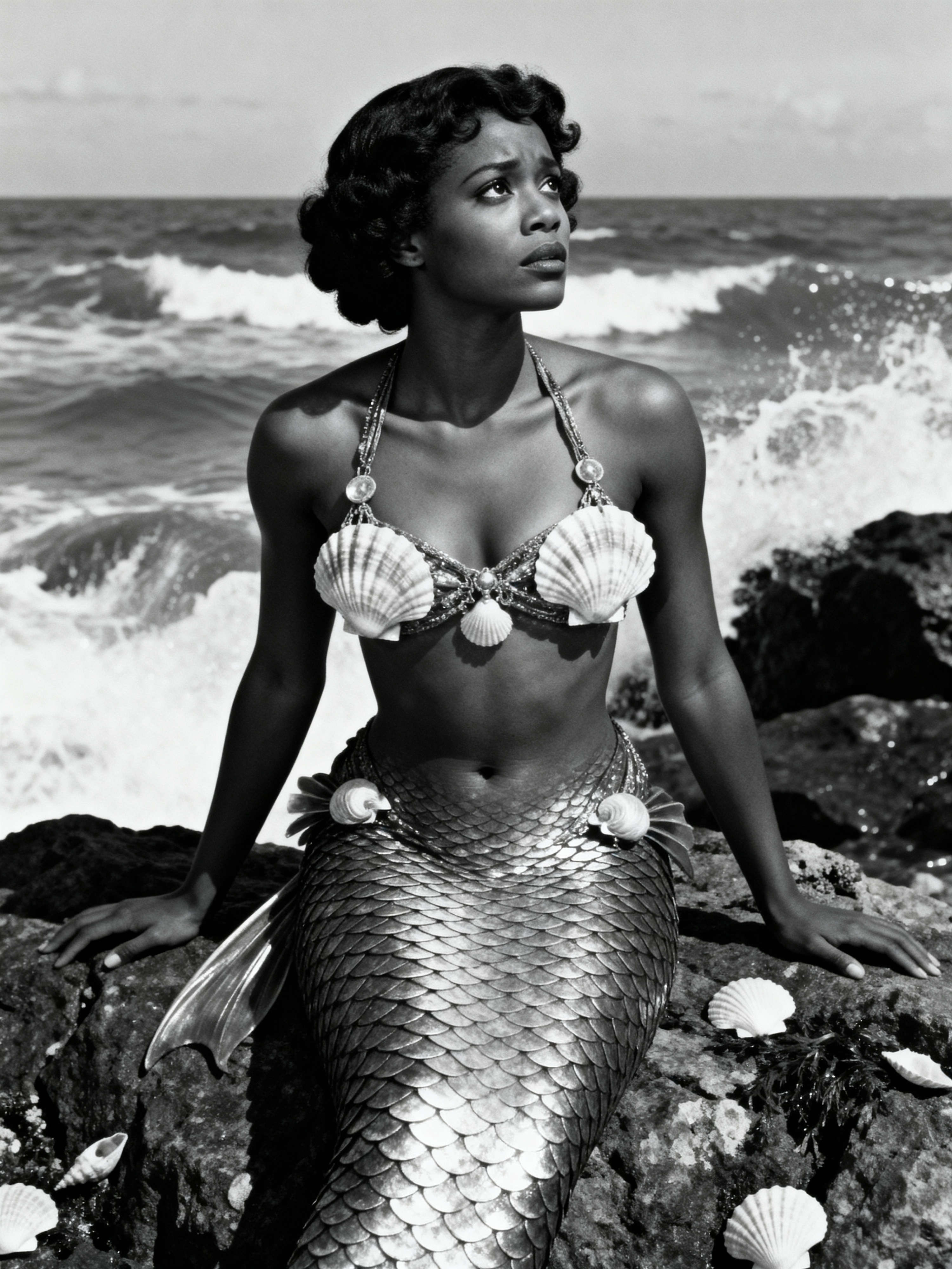black and white 35mm film of model as a 1920s silent film mermaid on rocky shore, wearing scaled costume with shell accessories, melancholic expression gazing at sea , theatrical waves, black and white with dreamy soft focus, fantasy ocean backdrop