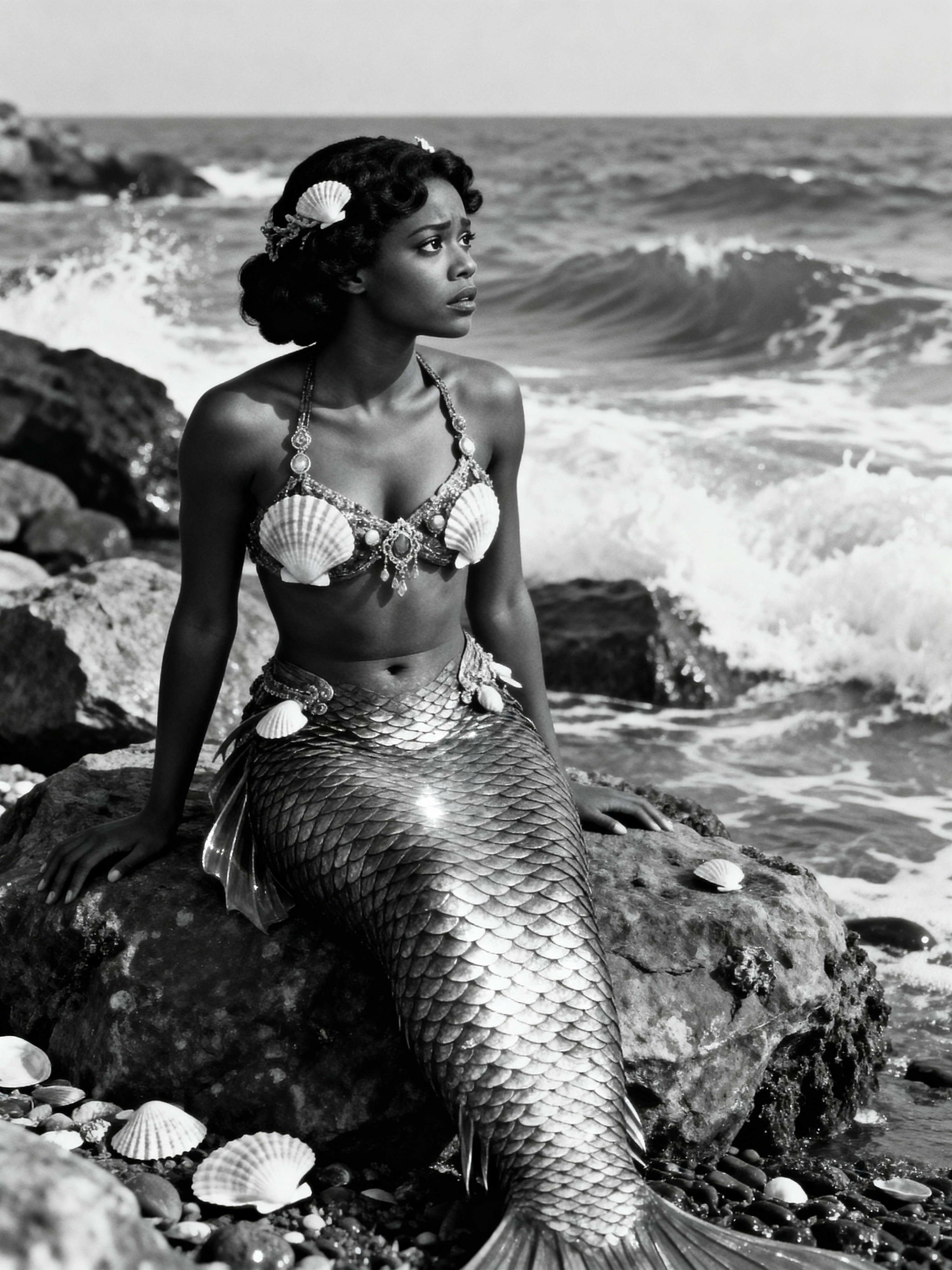black and white 35mm film of model as a 1920s silent film mermaid on rocky shore, wearing scaled costume with shell accessories, melancholic expression gazing at sea , theatrical waves, black and white with dreamy soft focus, fantasy ocean backdrop