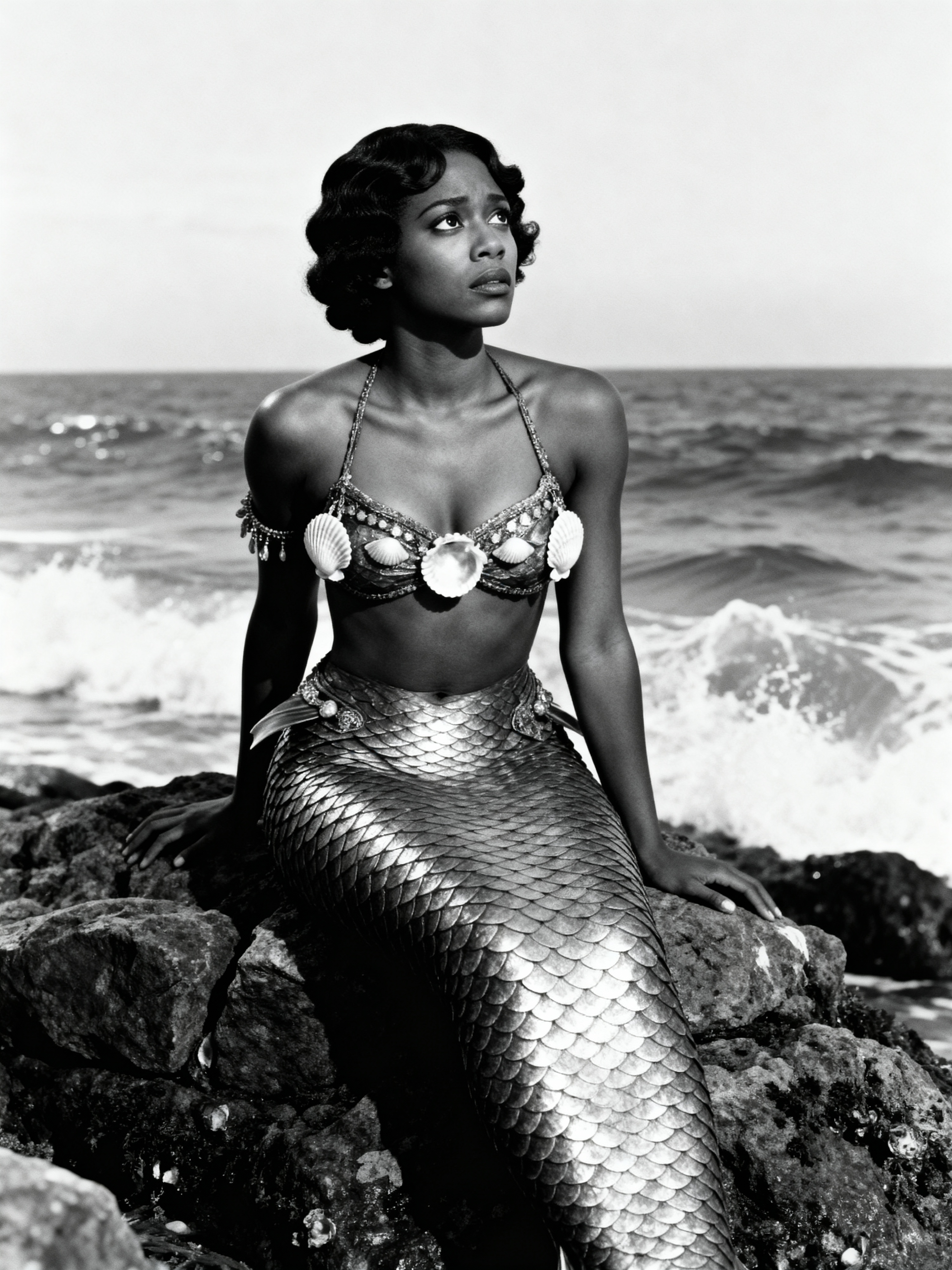 black and white 35mm film of model as a 1920s silent film mermaid on rocky shore, wearing scaled costume with shell accessories, melancholic expression gazing at sea , theatrical waves, black and white with dreamy soft focus, fantasy ocean backdrop