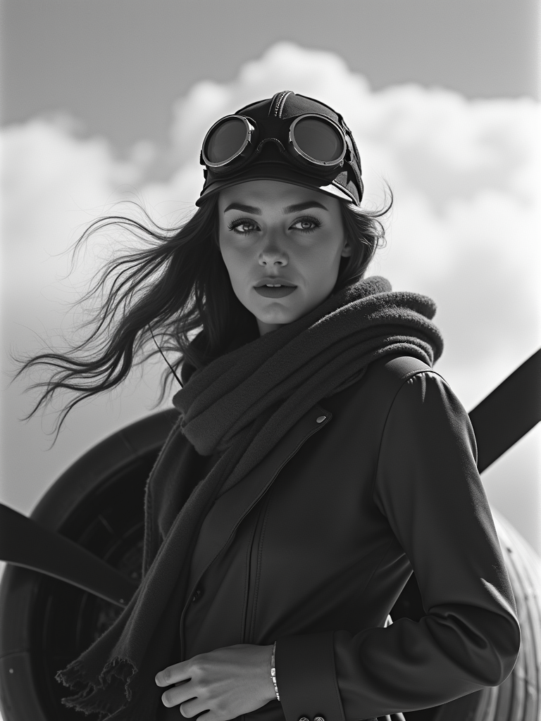 black and white 35mm film of model as a 1920s silent film pilot wearing leather aviator cap and goggles, dramatic wind-blown scarf, triumphant expression , airplane propeller visible in frame, high-contrast black and white, cloudy sky backdrop