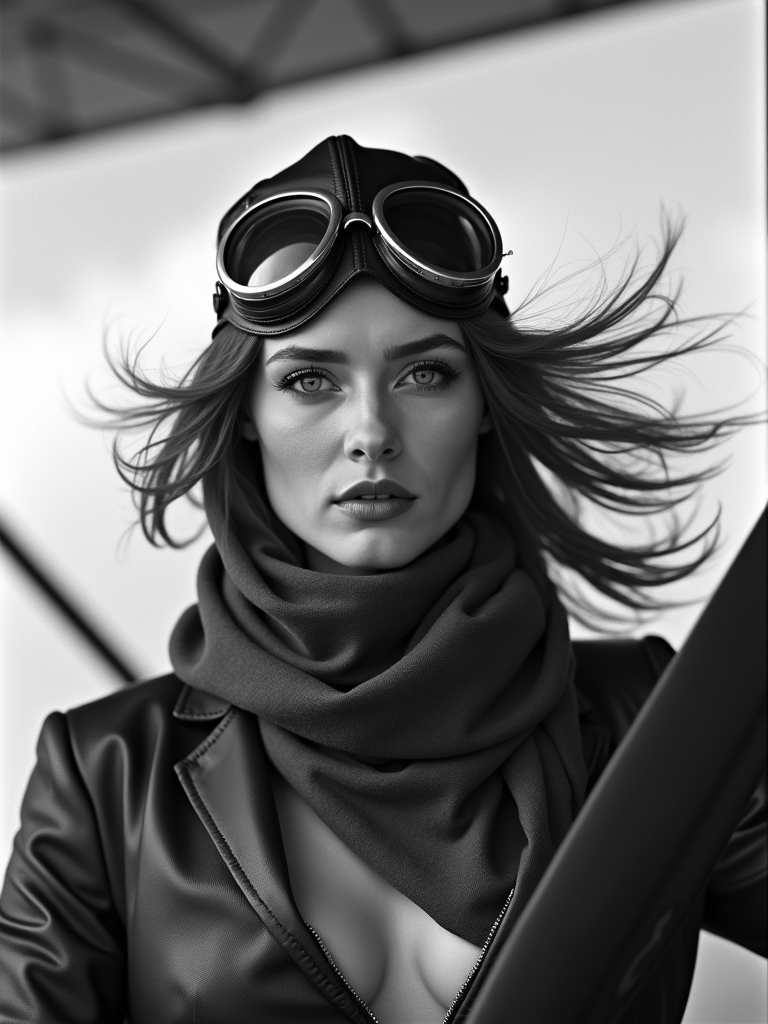 black and white 35mm film of model as a 1920s silent film pilot wearing leather aviator cap and goggles, dramatic wind-blown scarf, triumphant expression , airplane propeller visible in frame, high-contrast black and white, cloudy sky backdrop