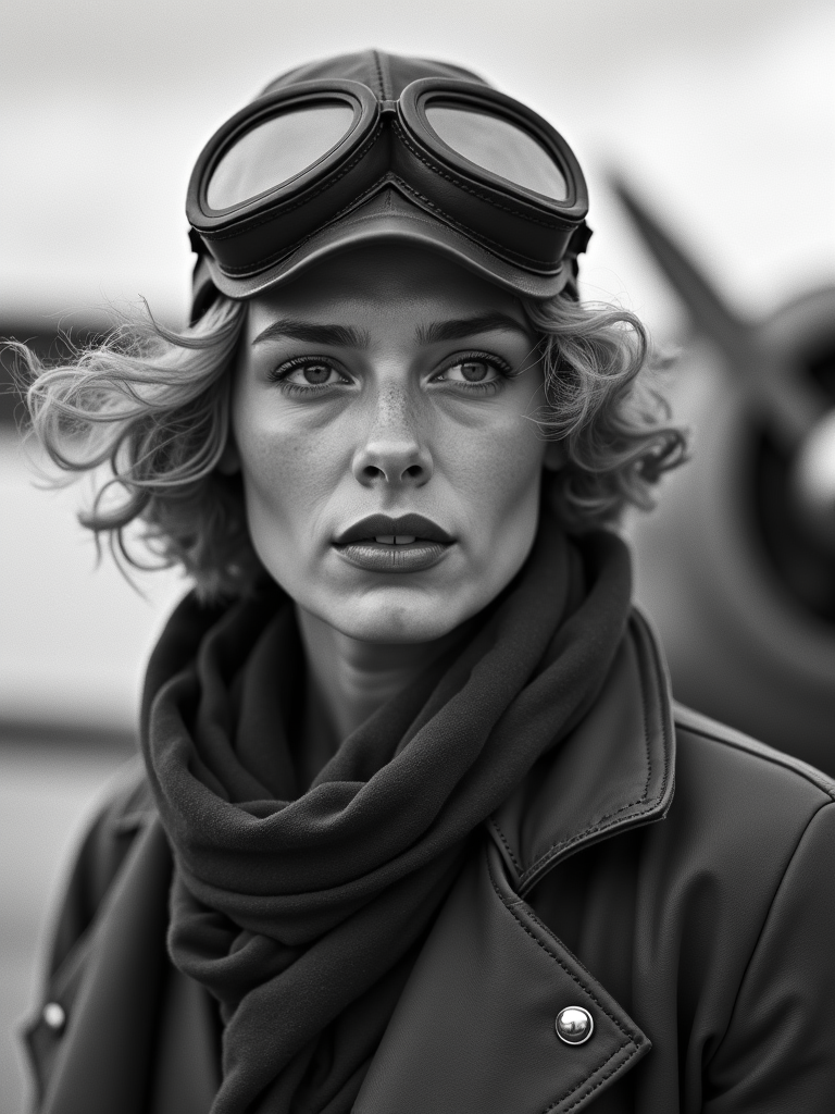 black and white 35mm film of model as a 1920s silent film pilot wearing leather aviator cap and goggles, dramatic wind-blown scarf, triumphant expression , airplane propeller visible in frame, high-contrast black and white, cloudy sky backdrop