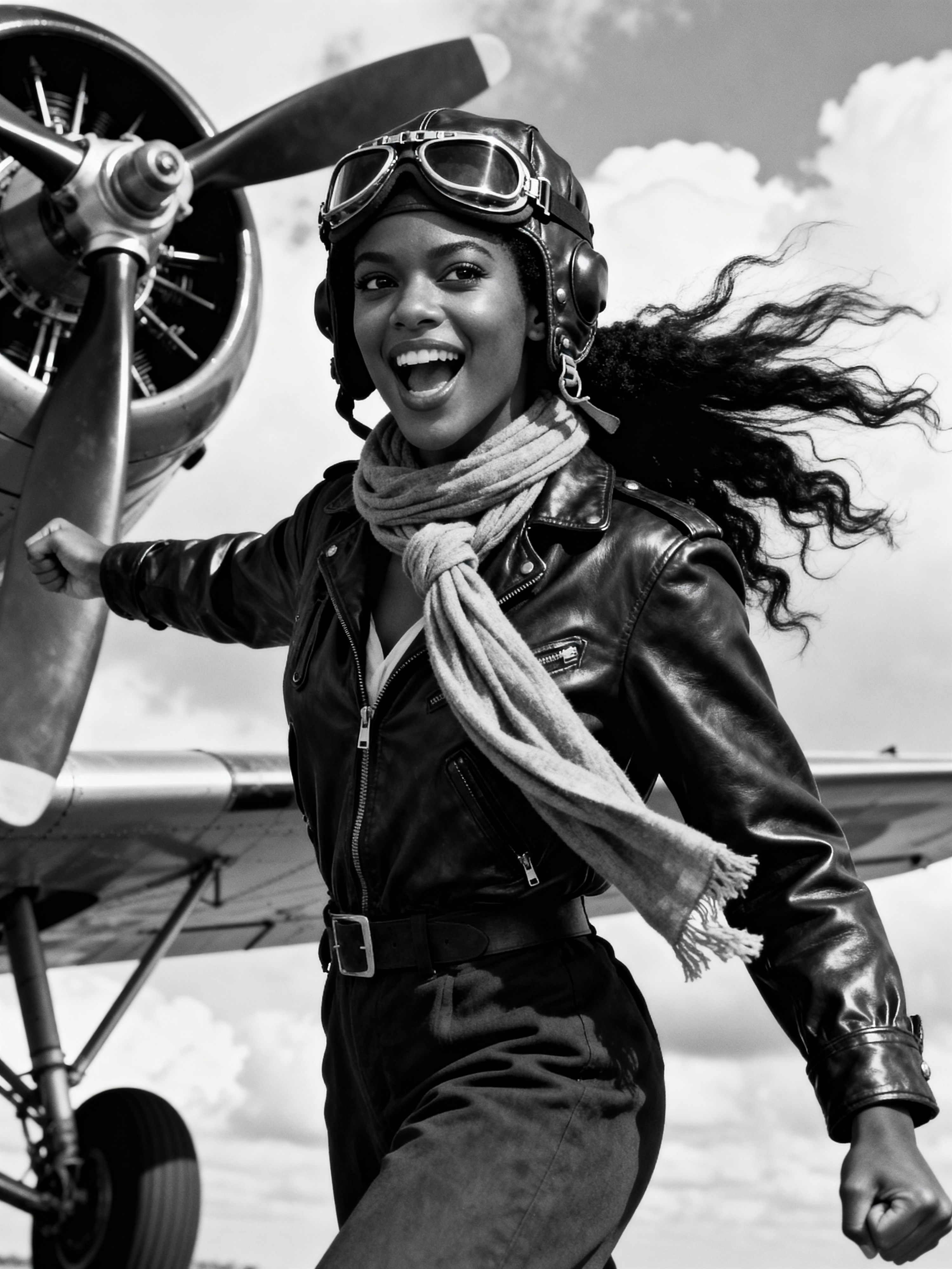 black and white 35mm film of model as a 1920s silent film pilot wearing leather aviator cap and goggles, dramatic wind-blown scarf, triumphant expression , airplane propeller visible in frame, high-contrast black and white, cloudy sky backdrop