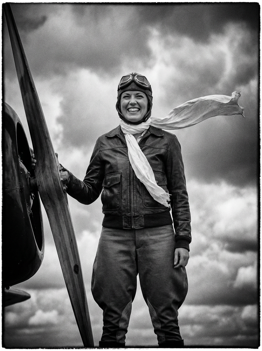 black and white 35mm film of model as a 1920s silent film pilot wearing leather aviator cap and goggles, dramatic wind-blown scarf, triumphant expression , airplane propeller visible in frame, high-contrast black and white, cloudy sky backdrop