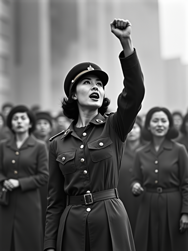 black and white 35mm film of model as a 1920s silent film revolutionary leader addressing a crowd, wearing a military-inspired outfit with cap, passionate expression with raised fist , dramatic low angle shot, black and white with vintage film grain, propaganda poster aesthetic
