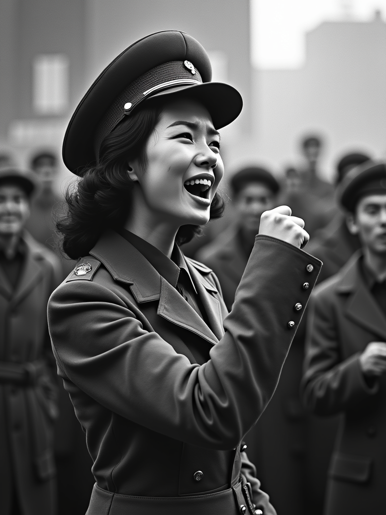 black and white 35mm film of model as a 1920s silent film revolutionary leader addressing a crowd, wearing a military-inspired outfit with cap, passionate expression with raised fist , dramatic low angle shot, black and white with vintage film grain, propaganda poster aesthetic