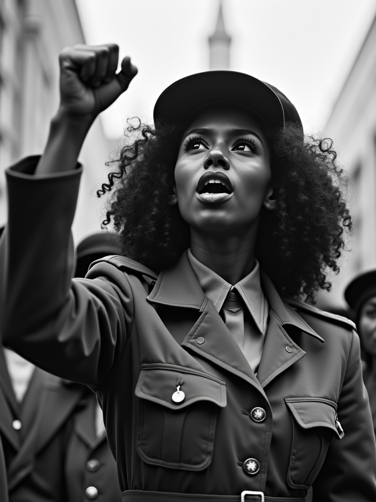 black and white 35mm film of model as a 1920s silent film revolutionary leader addressing a crowd, wearing a military-inspired outfit with cap, passionate expression with raised fist , dramatic low angle shot, black and white with vintage film grain, propaganda poster aesthetic