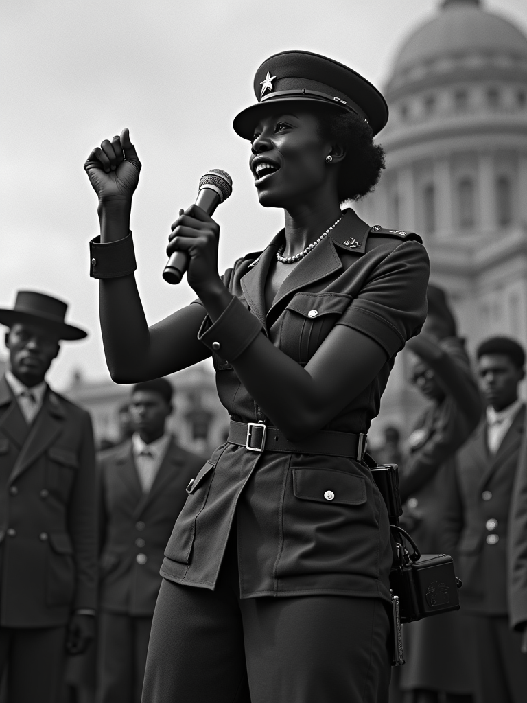 black and white 35mm film of model as a 1920s silent film revolutionary leader addressing a crowd, wearing a military-inspired outfit with cap, passionate expression with raised fist , dramatic low angle shot, black and white with vintage film grain, propaganda poster aesthetic