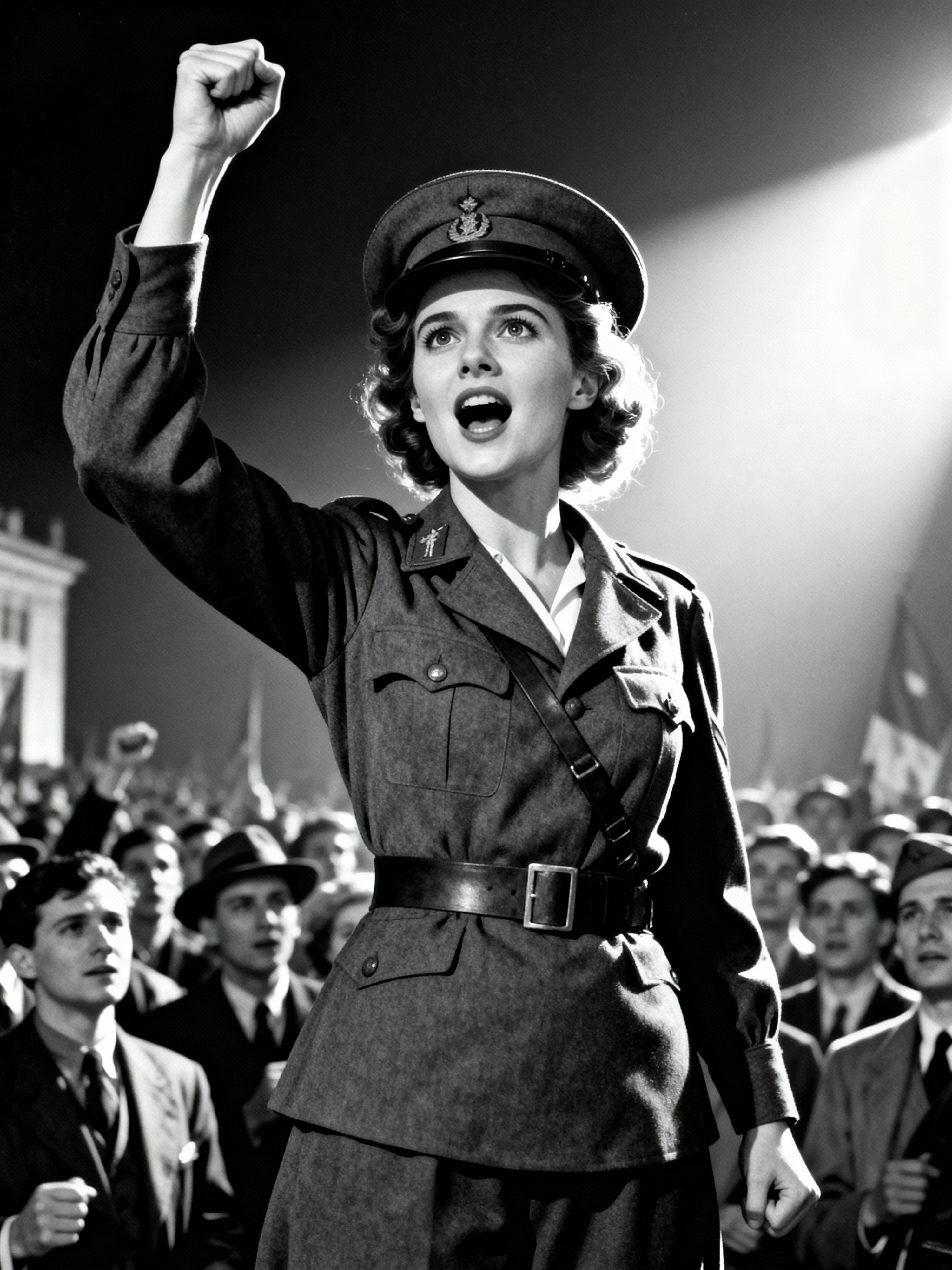 black and white 35mm film of model as a 1920s silent film revolutionary leader addressing a crowd, wearing a military-inspired outfit with cap, passionate expression with raised fist , dramatic low angle shot, black and white with vintage film grain, propaganda poster aesthetic