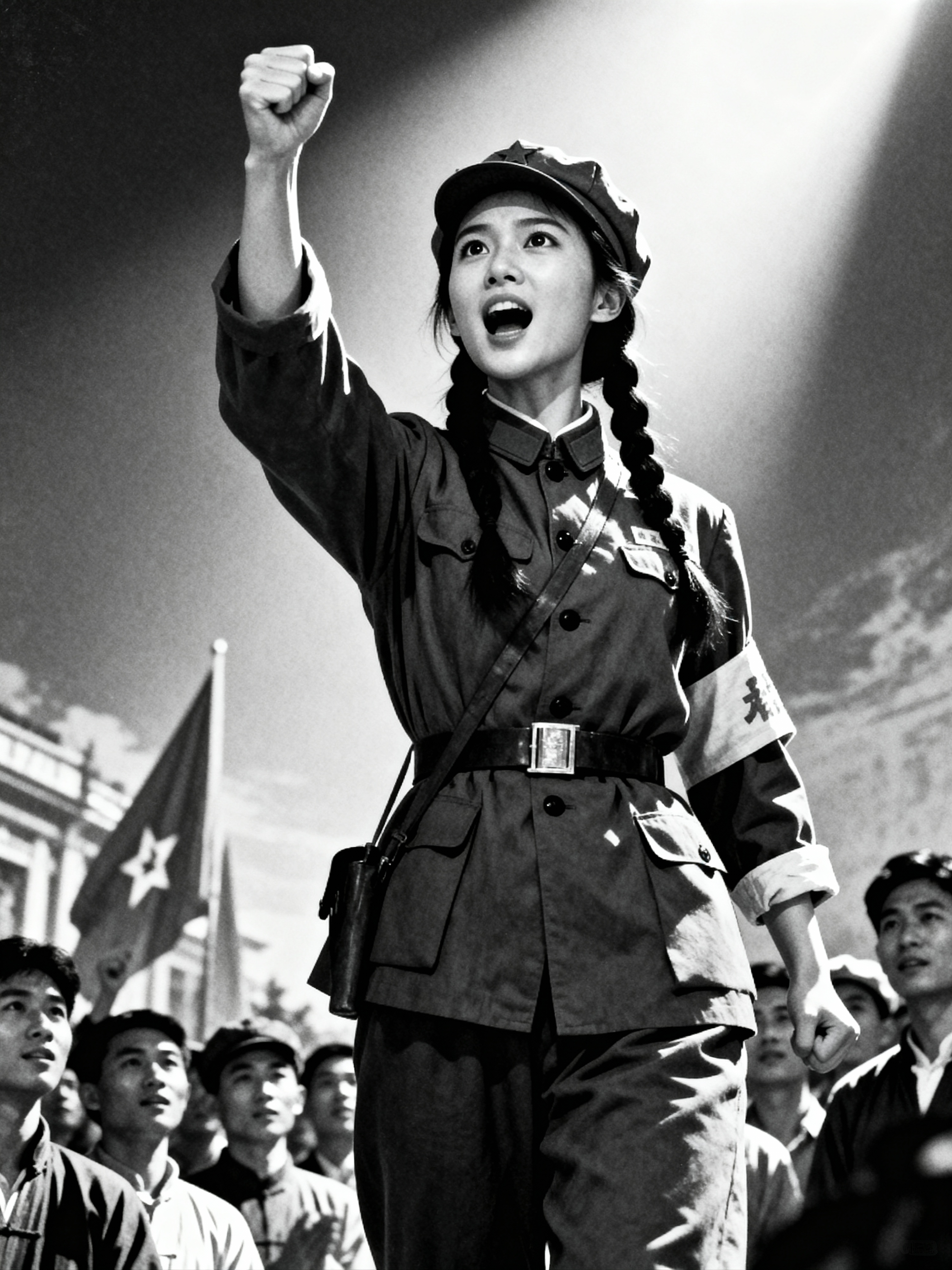 black and white 35mm film of model as a 1920s silent film revolutionary leader addressing a crowd, wearing a military-inspired outfit with cap, passionate expression with raised fist , dramatic low angle shot, black and white with vintage film grain, propaganda poster aesthetic