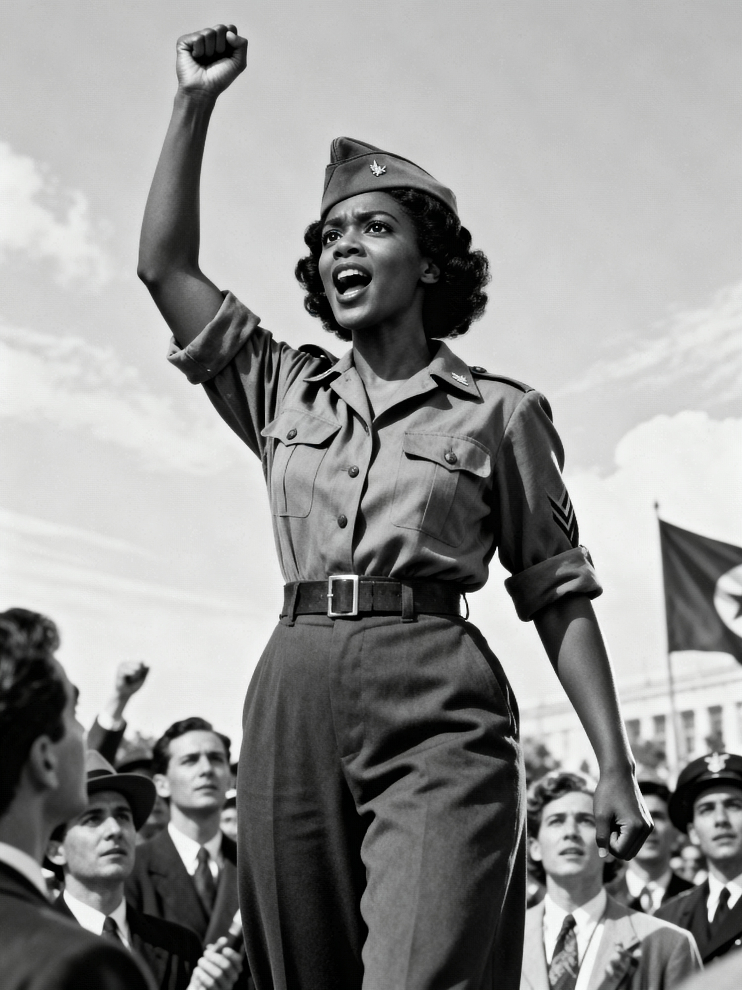 black and white 35mm film of model as a 1920s silent film revolutionary leader addressing a crowd, wearing a military-inspired outfit with cap, passionate expression with raised fist , dramatic low angle shot, black and white with vintage film grain, propaganda poster aesthetic
