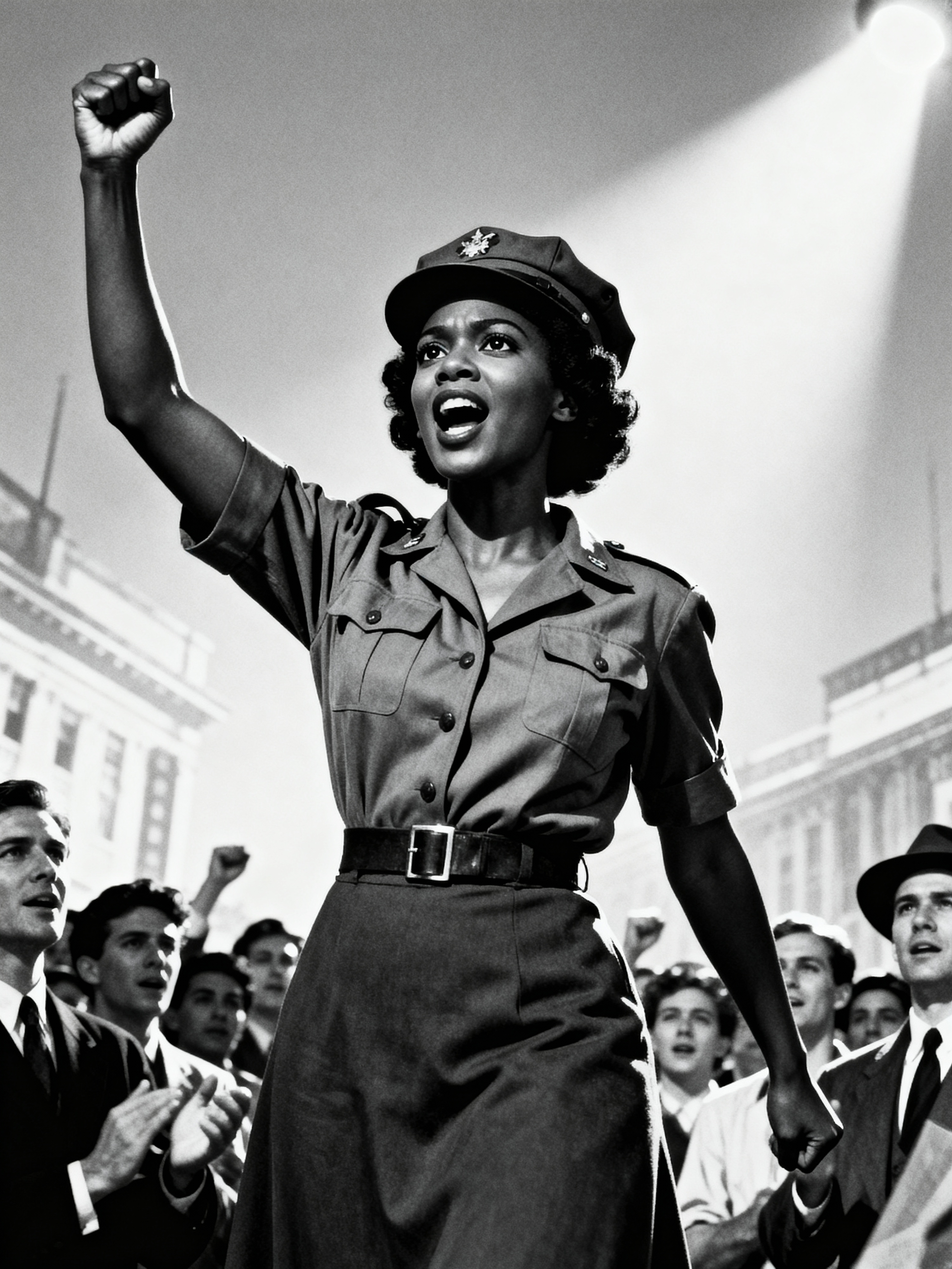 black and white 35mm film of model as a 1920s silent film revolutionary leader addressing a crowd, wearing a military-inspired outfit with cap, passionate expression with raised fist , dramatic low angle shot, black and white with vintage film grain, propaganda poster aesthetic
