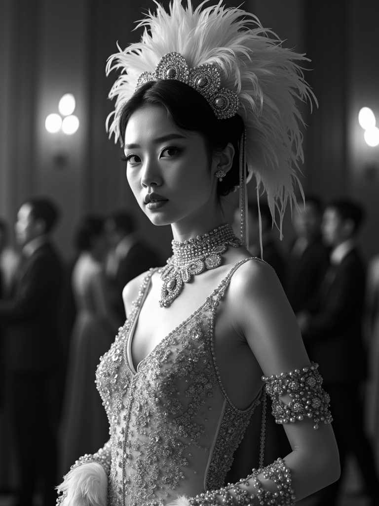 black and white 35mm film of model as a 1920s silent film society lady at a grand ball, wearing an elaborate beaded gown with feather headpiece, exaggerated haughty expression , theatrical pose, black and white with iris vignette effect, ballroom setting