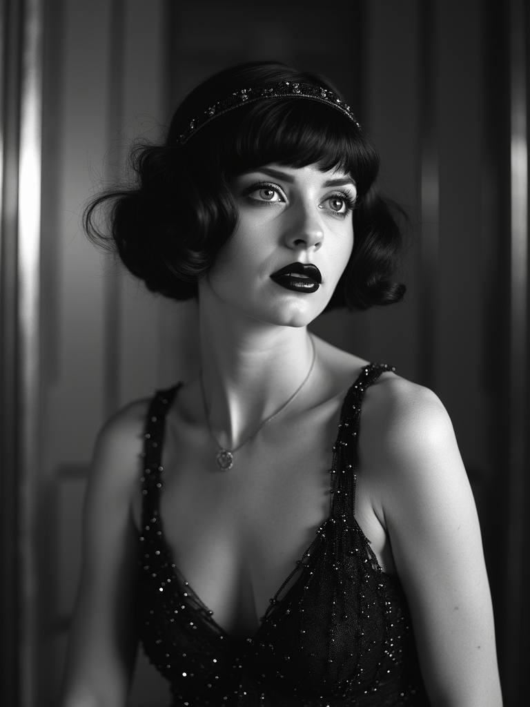 black and white 35mm film of model as a 1920s silent film starlet with exaggerated dramatic expression, wearing a flapper dress with beaded details, dramatic makeup with dark lips and defined eyes , high-contrast black and white photography, vintage film grain, art deco set design