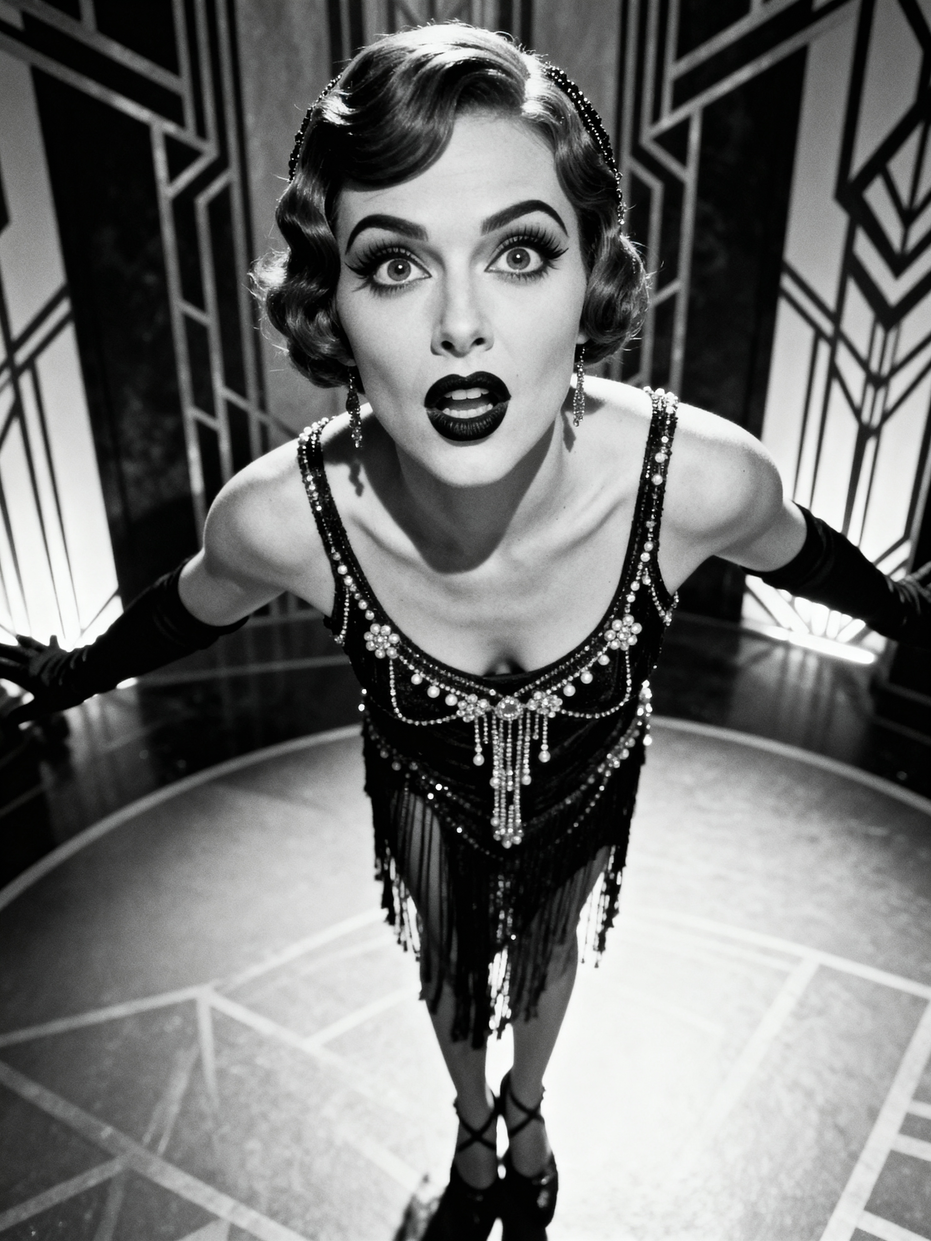 black and white 35mm film of model as a 1920s silent film starlet with exaggerated dramatic expression, wearing a flapper dress with beaded details, dramatic makeup with dark lips and defined eyes , high-contrast black and white photography, vintage film grain, art deco set design