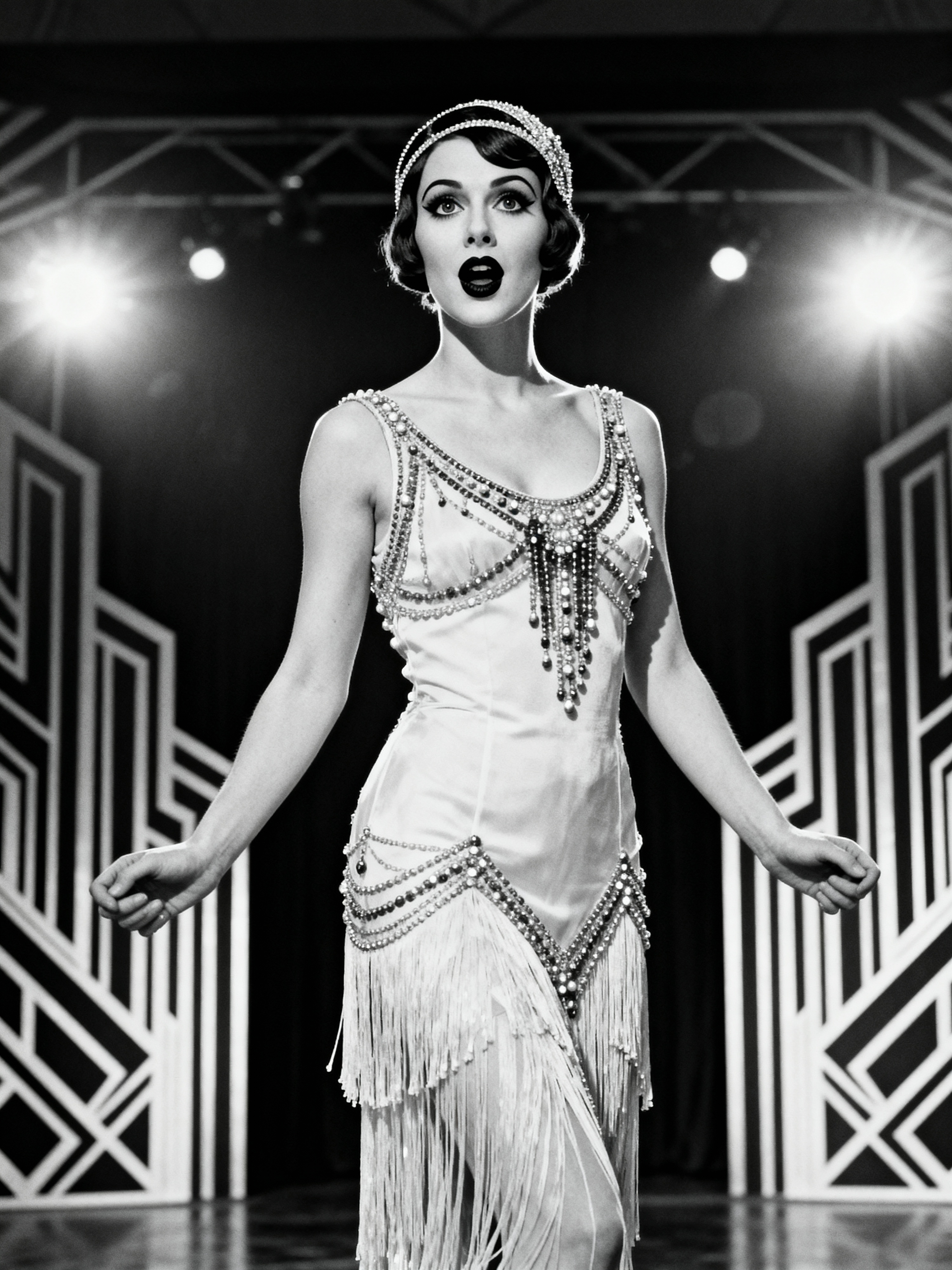 black and white 35mm film of model as a 1920s silent film starlet with exaggerated dramatic expression, wearing a flapper dress with beaded details, dramatic makeup with dark lips and defined eyes , high-contrast black and white photography, vintage film grain, art deco set design