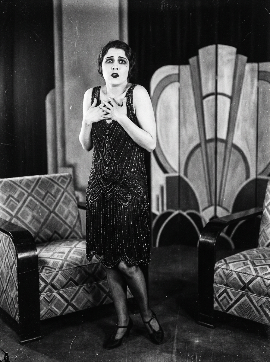 black and white 35mm film of model as a 1920s silent film starlet with exaggerated dramatic expression, wearing a flapper dress with beaded details, dramatic makeup with dark lips and defined eyes , high-contrast black and white photography, vintage film grain, art deco set design