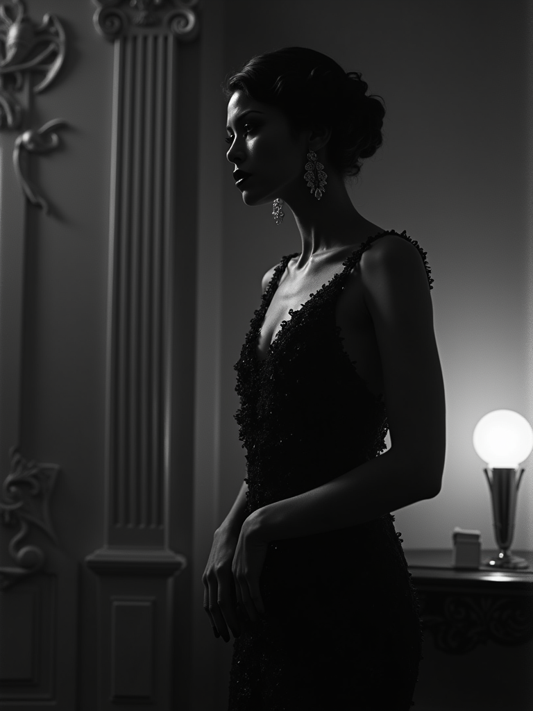 black and white 35mm film of model as a 1920s silent film vamp with dramatic side lighting, wearing a glamorous 1920s evening gown, theatrical menacing expression , high-contrast shadows, black and white with silent era film grain, ornate vintage setting