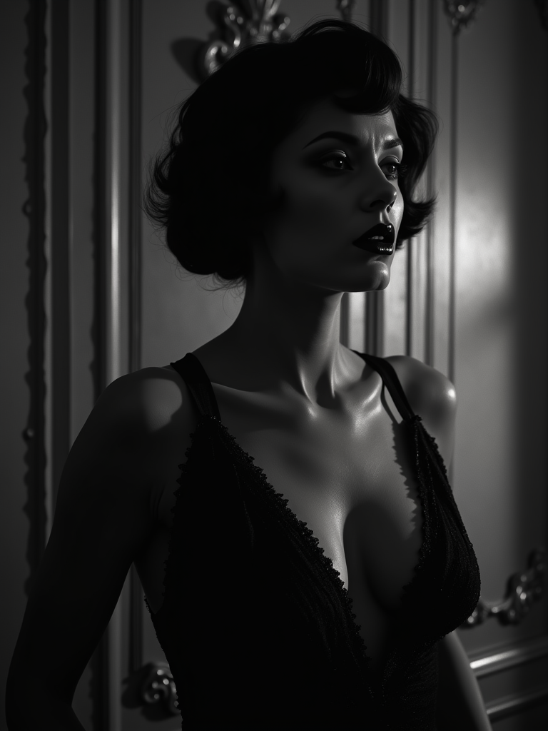 black and white 35mm film of model as a 1920s silent film vamp with dramatic side lighting, wearing a glamorous 1920s evening gown, theatrical menacing expression , high-contrast shadows, black and white with silent era film grain, ornate vintage setting