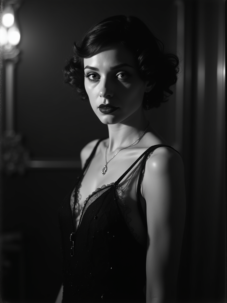 black and white 35mm film of model as a 1920s silent film vamp with dramatic side lighting, wearing a glamorous 1920s evening gown, theatrical menacing expression , high-contrast shadows, black and white with silent era film grain, ornate vintage setting