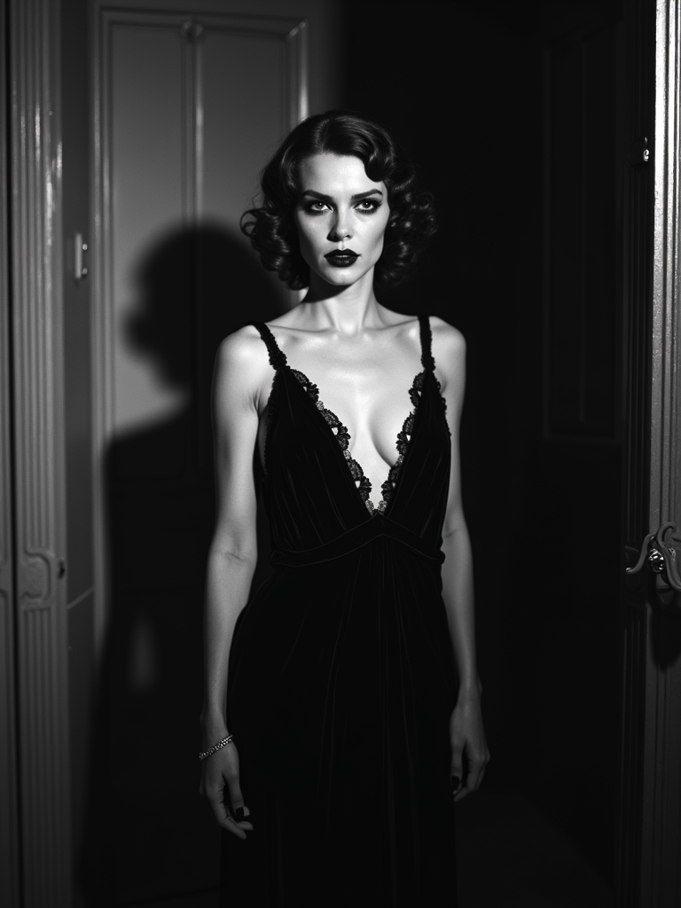 black and white 35mm film of model as a 1920s silent film vamp with dramatic side lighting, wearing a glamorous 1920s evening gown, theatrical menacing expression , high-contrast shadows, black and white with silent era film grain, ornate vintage setting