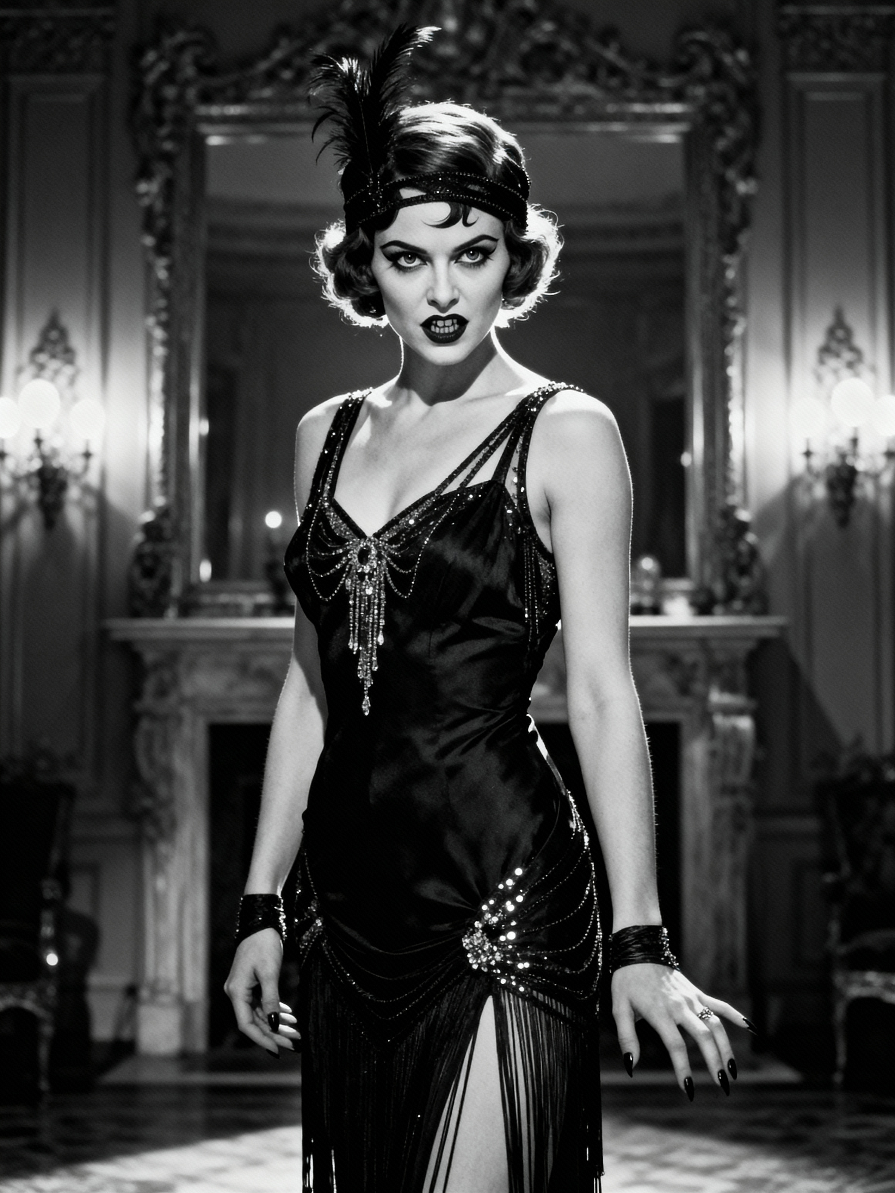 black and white 35mm film of model as a 1920s silent film vamp with dramatic side lighting, wearing a glamorous 1920s evening gown, theatrical menacing expression , high-contrast shadows, black and white with silent era film grain, ornate vintage setting