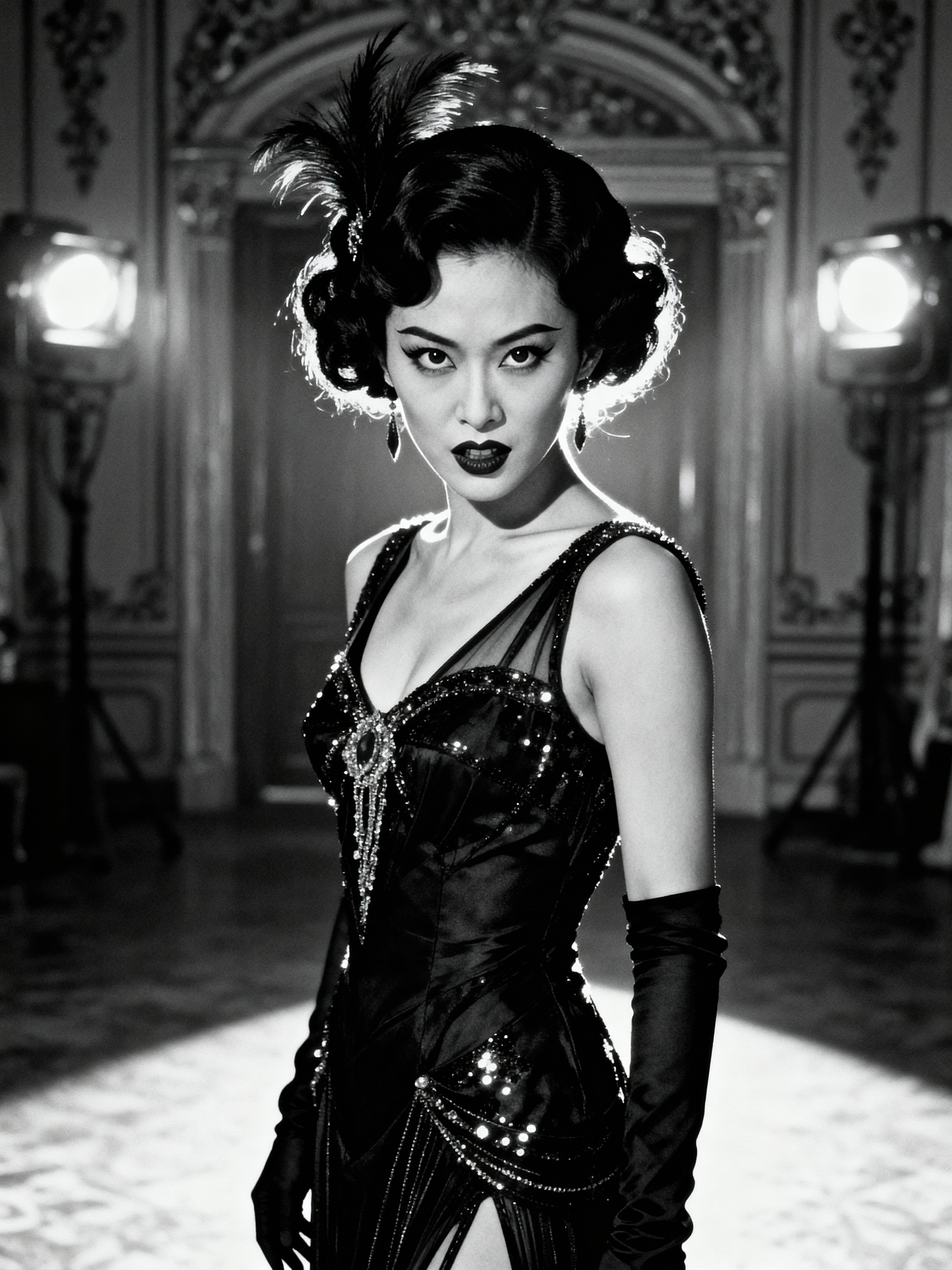 black and white 35mm film of model as a 1920s silent film vamp with dramatic side lighting, wearing a glamorous 1920s evening gown, theatrical menacing expression , high-contrast shadows, black and white with silent era film grain, ornate vintage setting