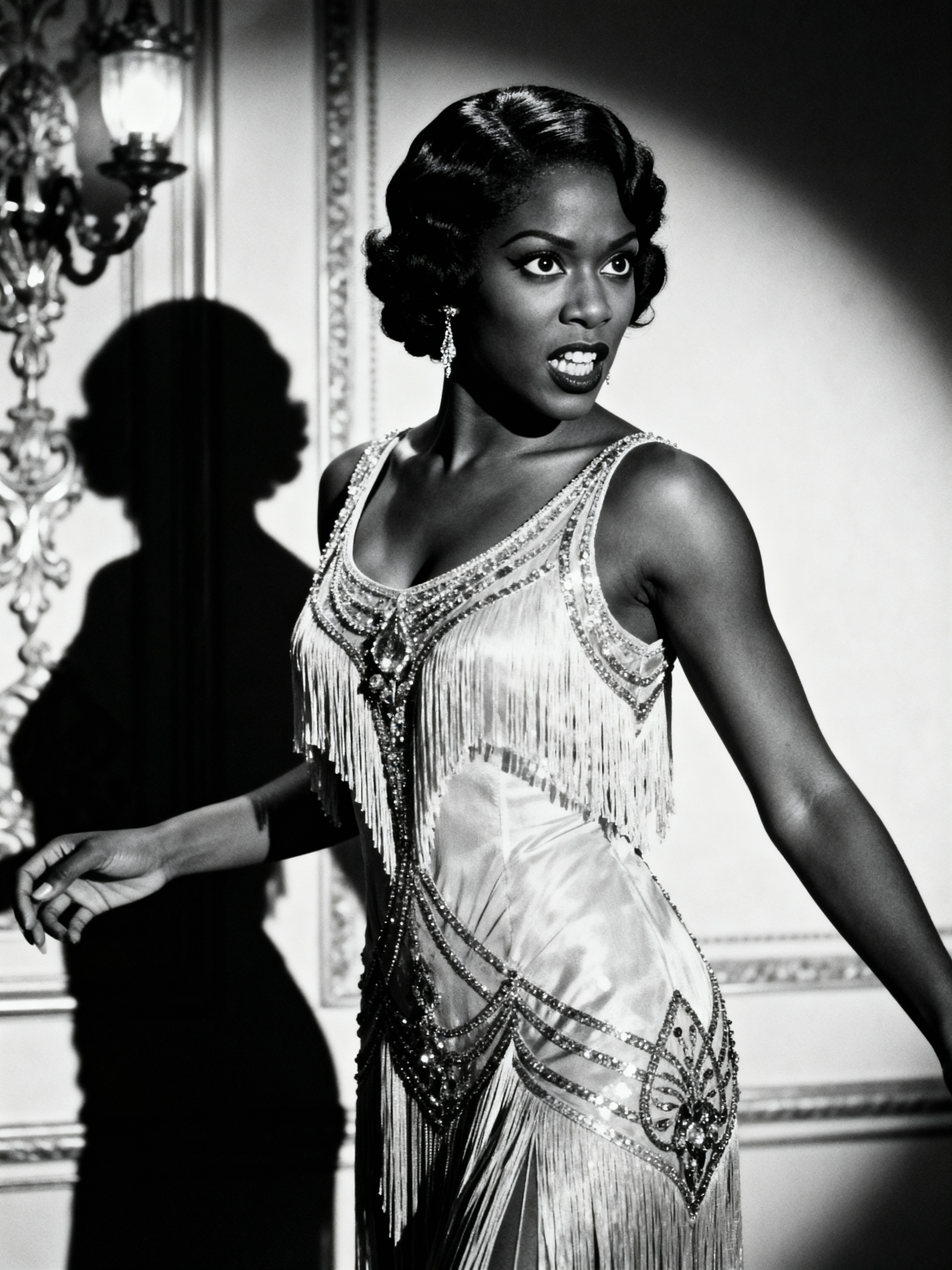 black and white 35mm film of model as a 1920s silent film vamp with dramatic side lighting, wearing a glamorous 1920s evening gown, theatrical menacing expression , high-contrast shadows, black and white with silent era film grain, ornate vintage setting