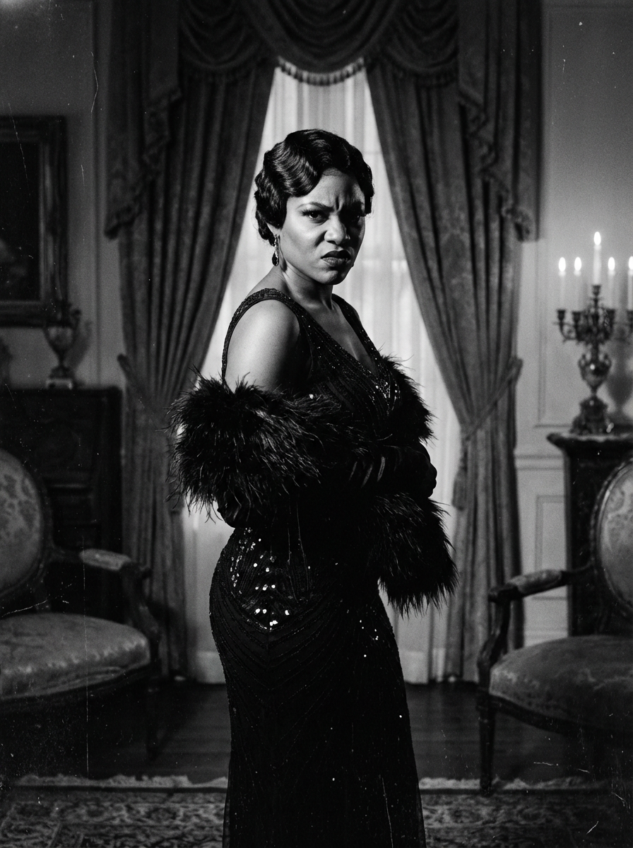 black and white 35mm film of model as a 1920s silent film vamp with dramatic side lighting, wearing a glamorous 1920s evening gown, theatrical menacing expression , high-contrast shadows, black and white with silent era film grain, ornate vintage setting
