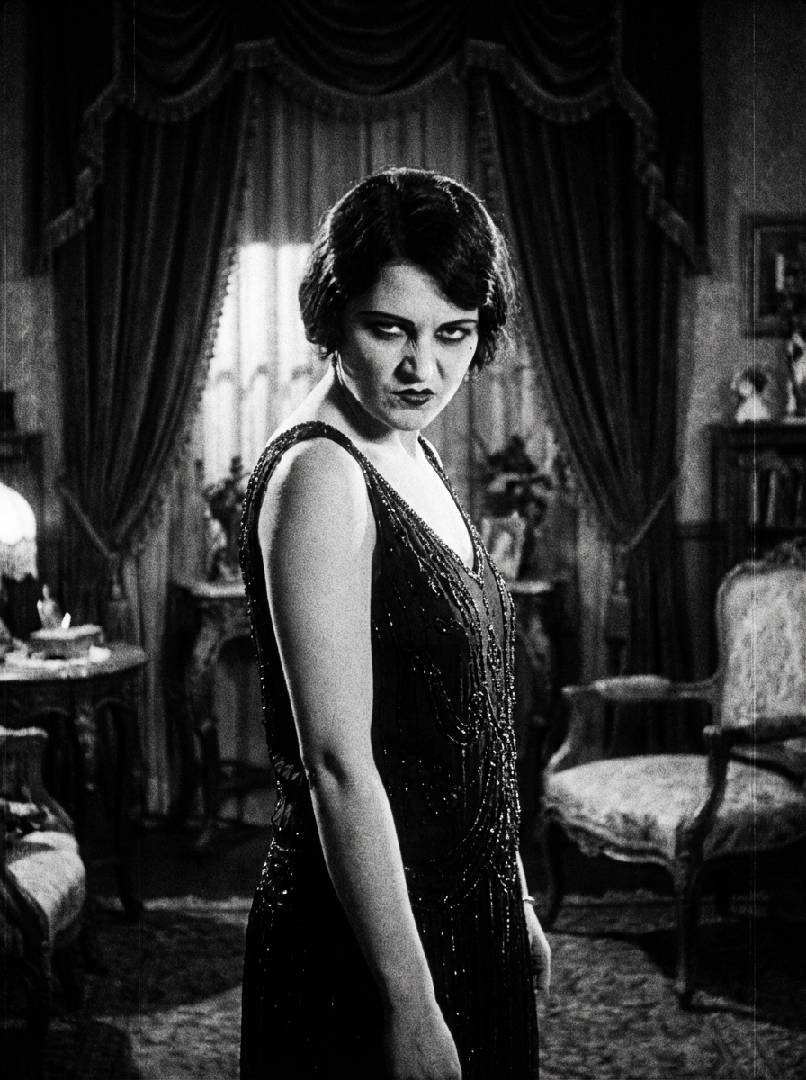 black and white 35mm film of model as a 1920s silent film vamp with dramatic side lighting, wearing a glamorous 1920s evening gown, theatrical menacing expression , high-contrast shadows, black and white with silent era film grain, ornate vintage setting