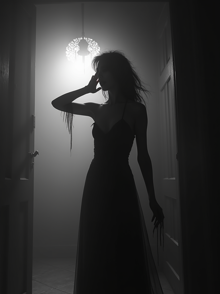 black and white 35mm film of model as a 1920s silent horror film scream queen, wearing a flowing nightgown, dramatically terrified expression with hand to face , harsh shadows, high-contrast black and white, gothic mansion set with fog effects