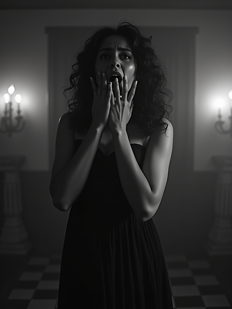black and white 35mm film of model as a 1920s silent horror film scream queen, wearing a flowing nightgown, dramatically terrified expression with hand to face , harsh shadows, high-contrast black and white, gothic mansion set with fog effects
