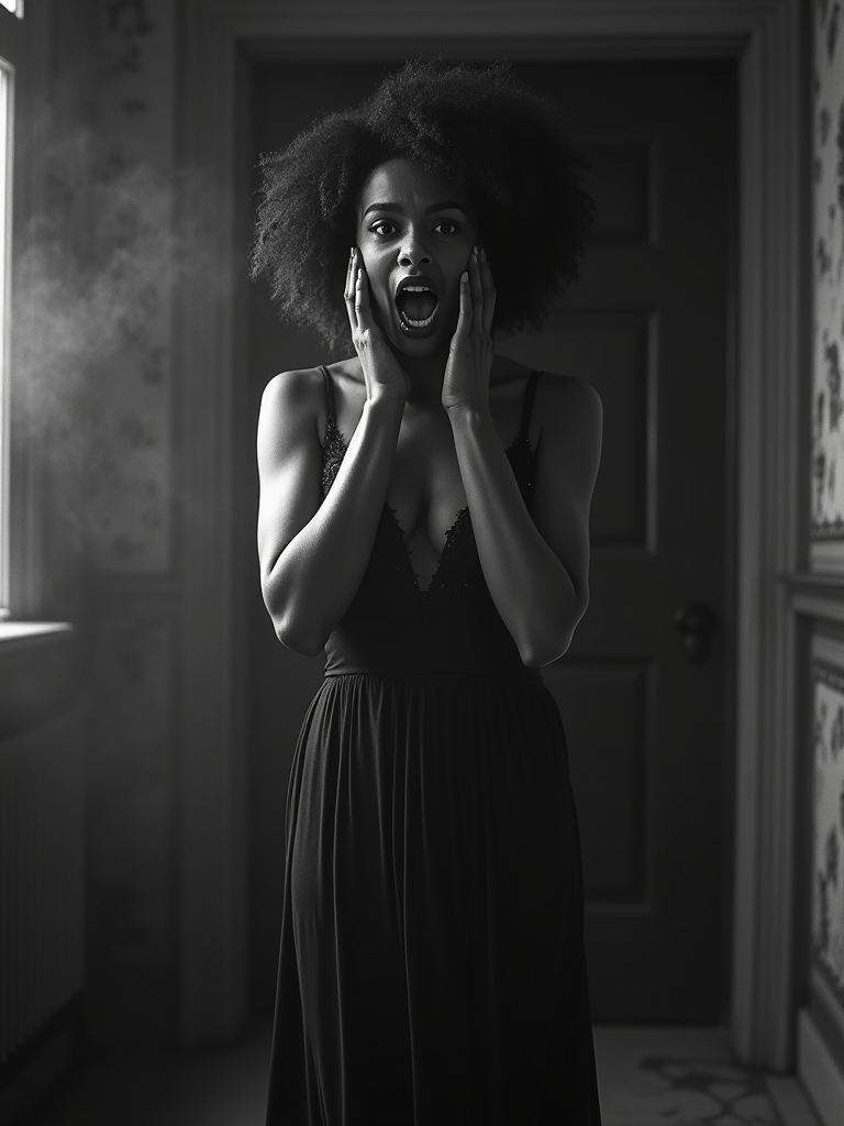 black and white 35mm film of model as a 1920s silent horror film scream queen, wearing a flowing nightgown, dramatically terrified expression with hand to face , harsh shadows, high-contrast black and white, gothic mansion set with fog effects