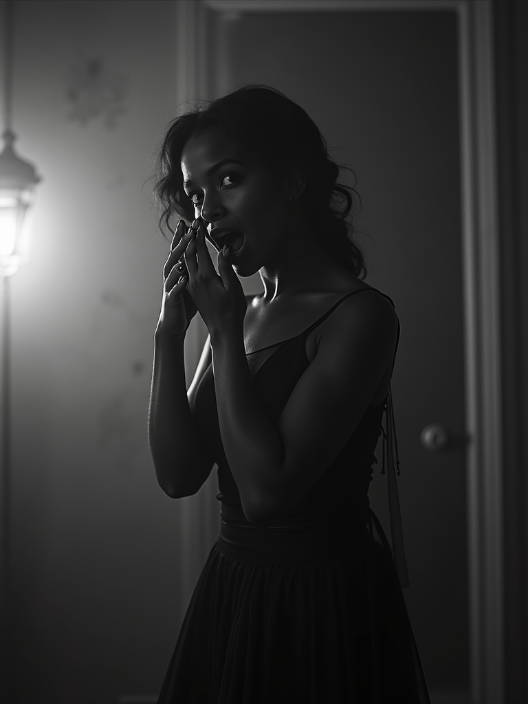 black and white 35mm film of model as a 1920s silent horror film scream queen, wearing a flowing nightgown, dramatically terrified expression with hand to face , harsh shadows, high-contrast black and white, gothic mansion set with fog effects