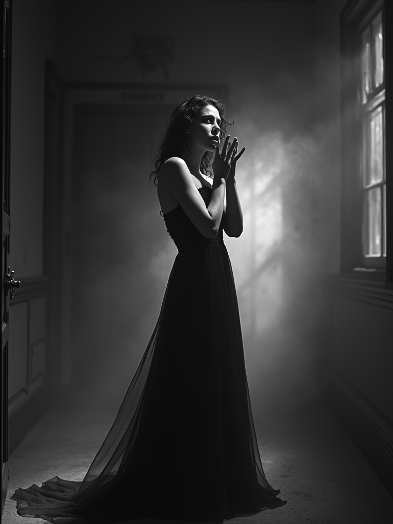 black and white 35mm film of model as a 1920s silent horror film scream queen, wearing a flowing nightgown, dramatically terrified expression with hand to face , harsh shadows, high-contrast black and white, gothic mansion set with fog effects