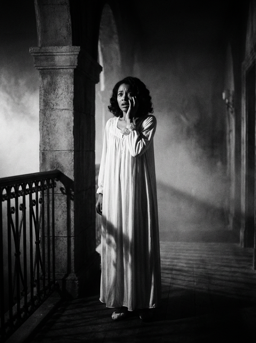 black and white 35mm film of model as a 1920s silent horror film scream queen, wearing a flowing nightgown, dramatically terrified expression with hand to face , harsh shadows, high-contrast black and white, gothic mansion set with fog effects