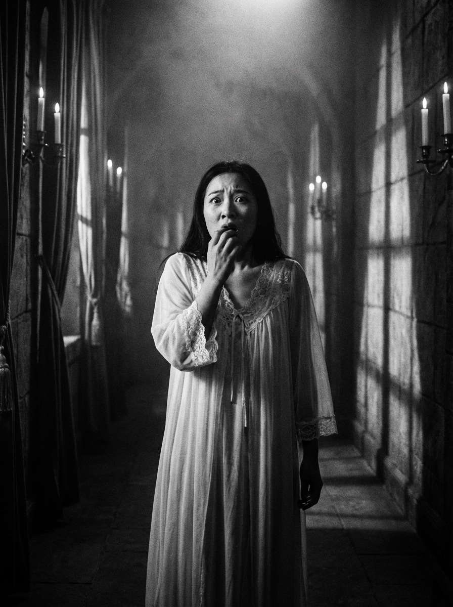 black and white 35mm film of model as a 1920s silent horror film scream queen, wearing a flowing nightgown, dramatically terrified expression with hand to face , harsh shadows, high-contrast black and white, gothic mansion set with fog effects